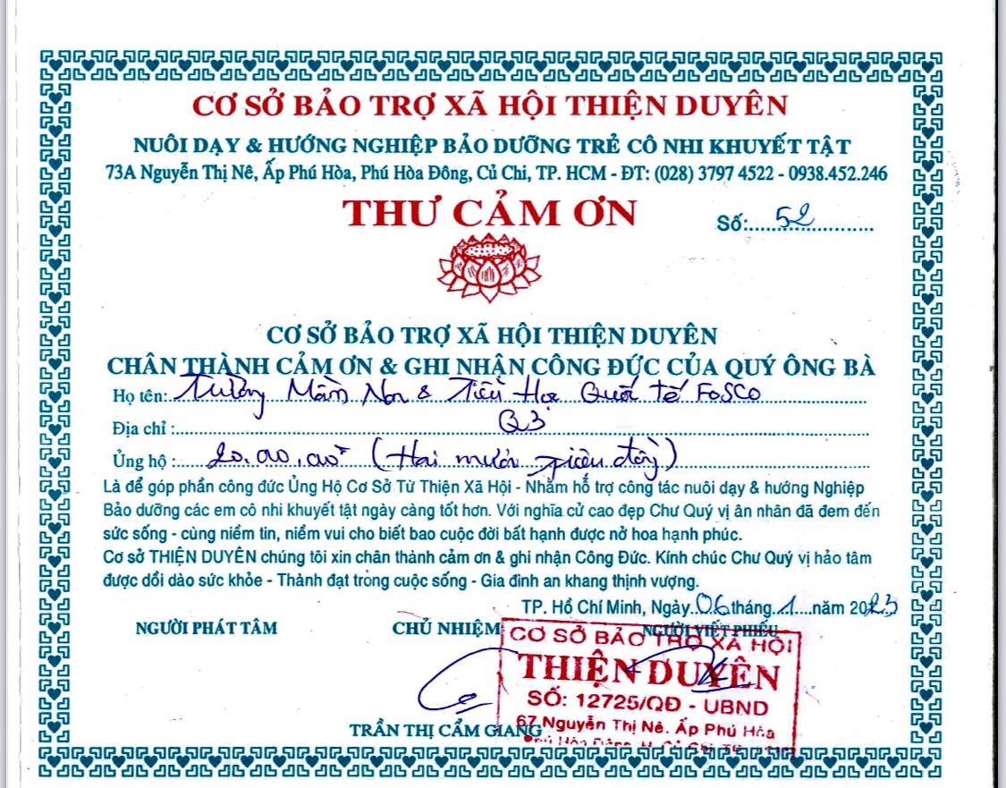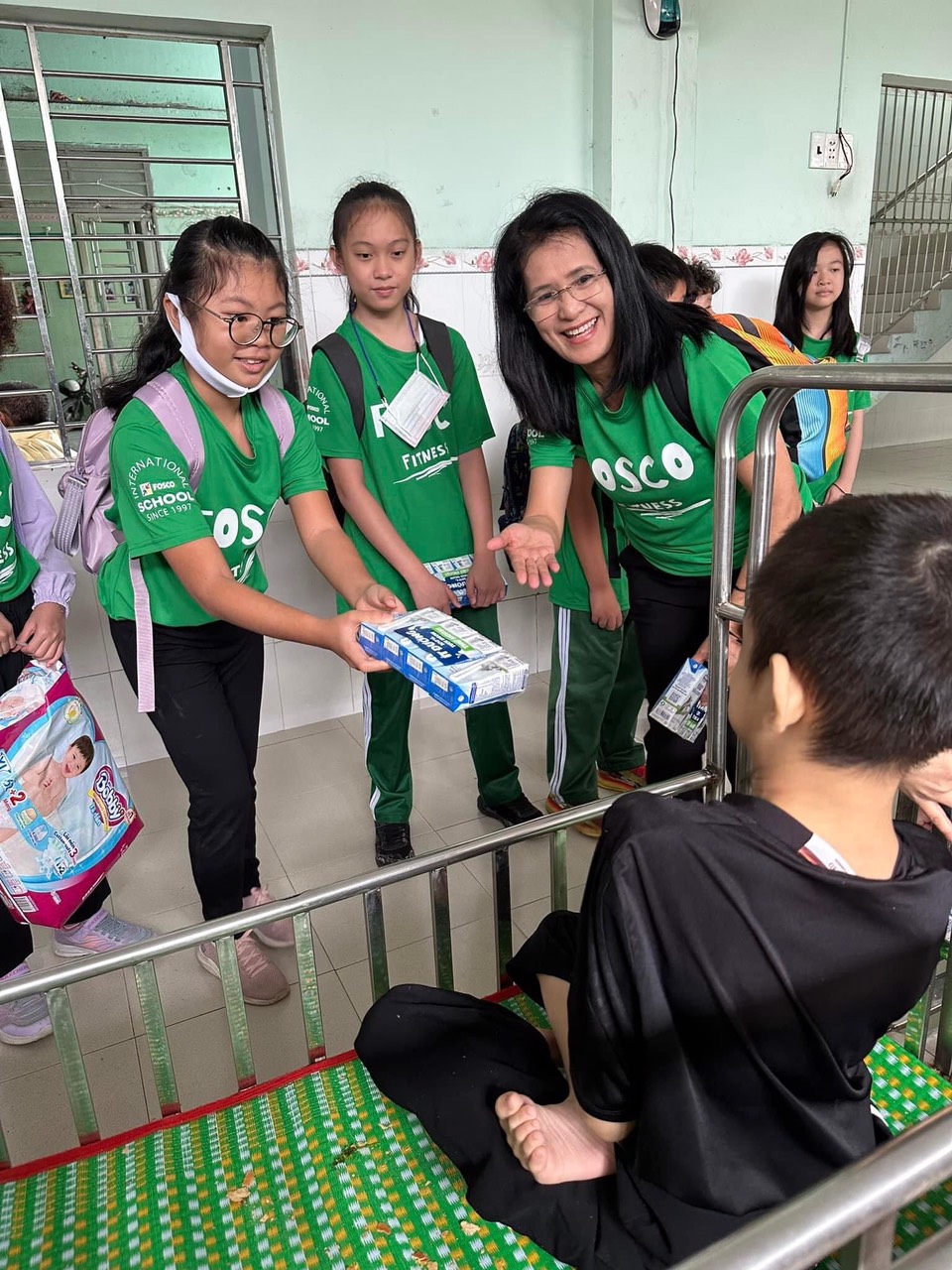 There is power in giving, smiling, touching, and caring. On January 6, 2023, the first FIS group led by Mr. Ho Trong Tri, Deputy General Director, the Principals, Vice Principals and the 5th Graders successfully delivered part of the proceeds of the Bake Sale Fundraising event and donations. The first of 3 recipients was Mai Am Thien Duyen Shelter in Cu Chi. Milk, diapers, and cash valued 35,000,000Vnd were given to warm the hearts of the residents in the shelter which include people with and without disabilities. It was such a joy to give back to the community and make the less-privileged feel loved.
