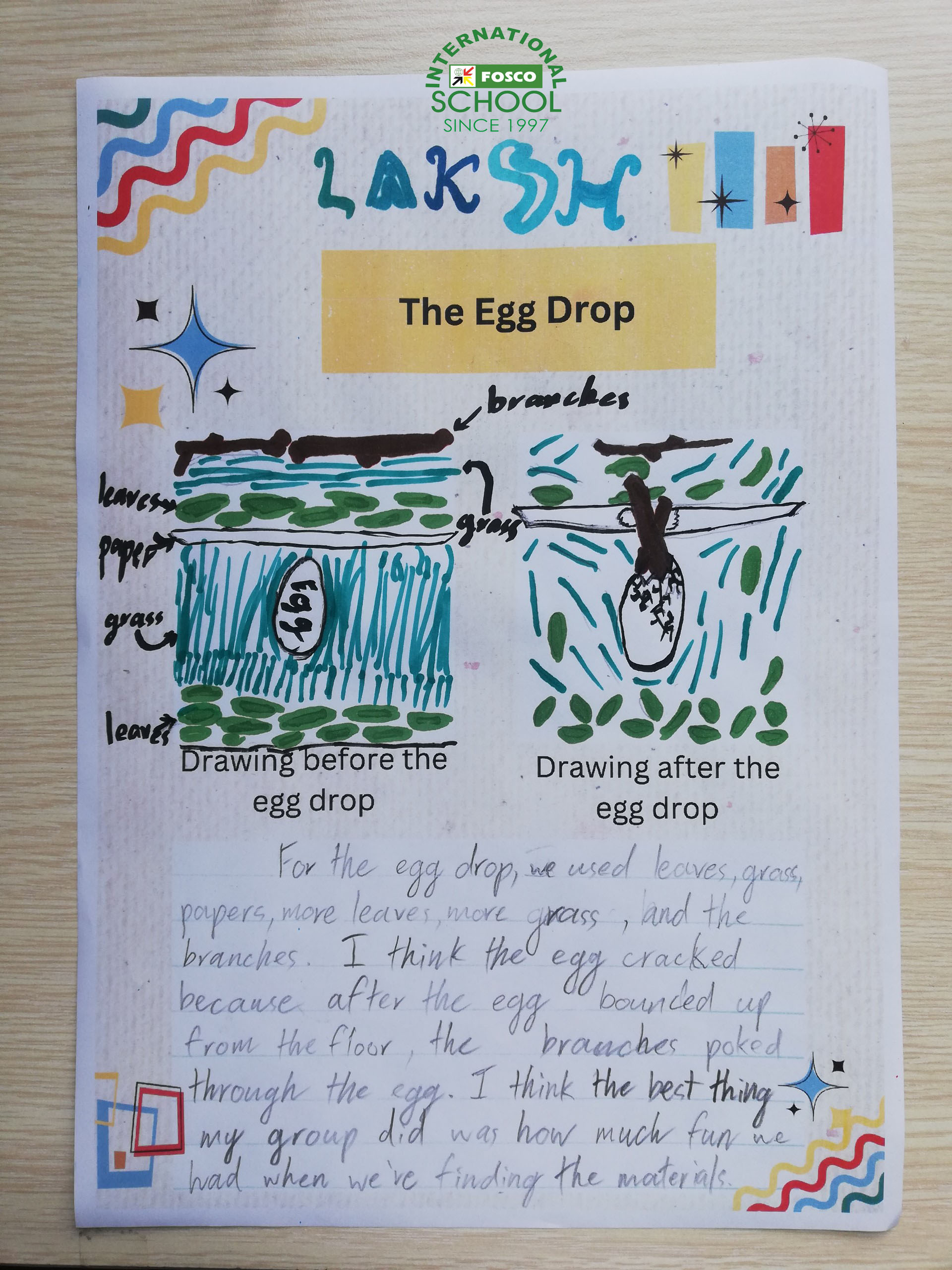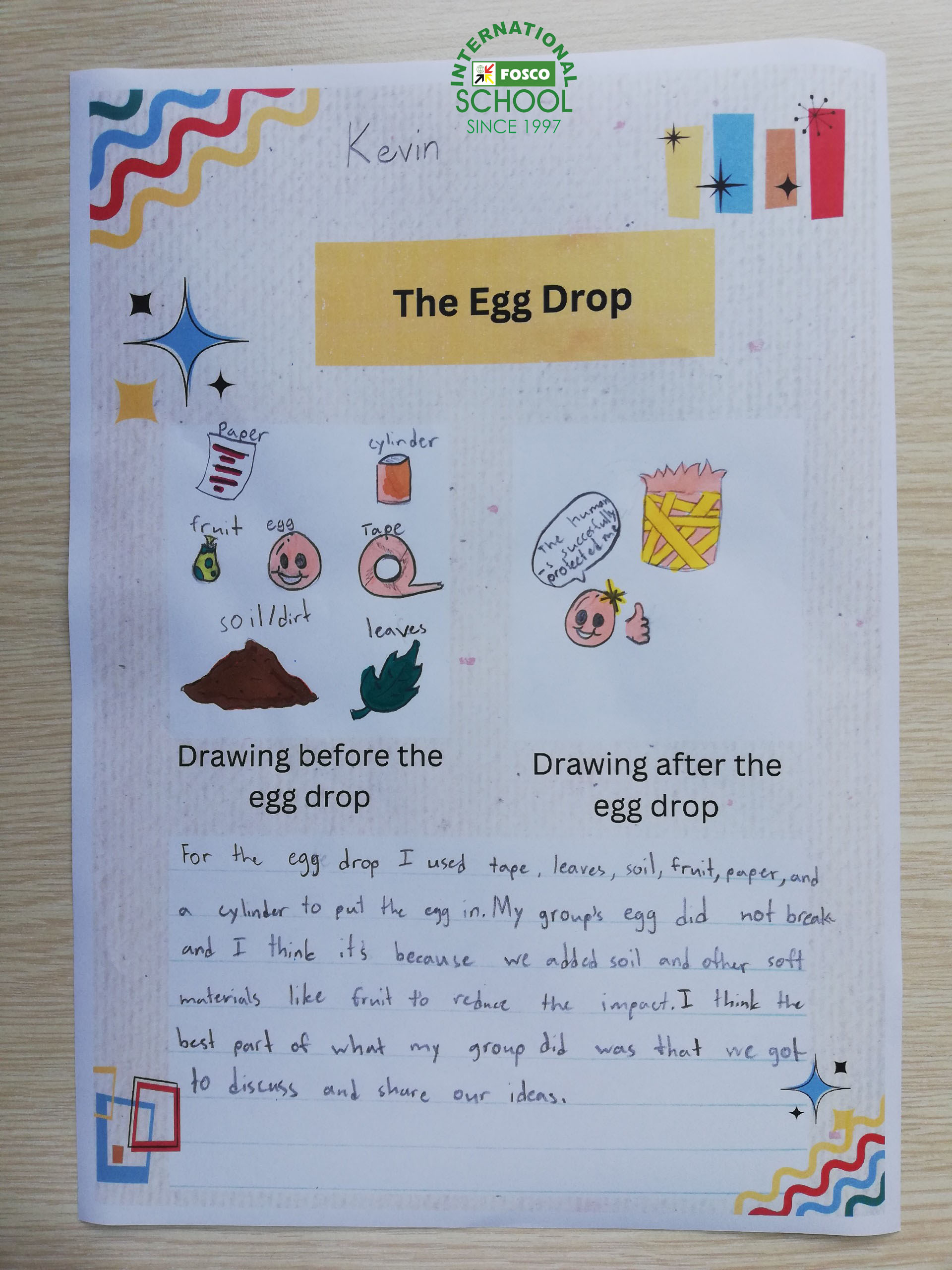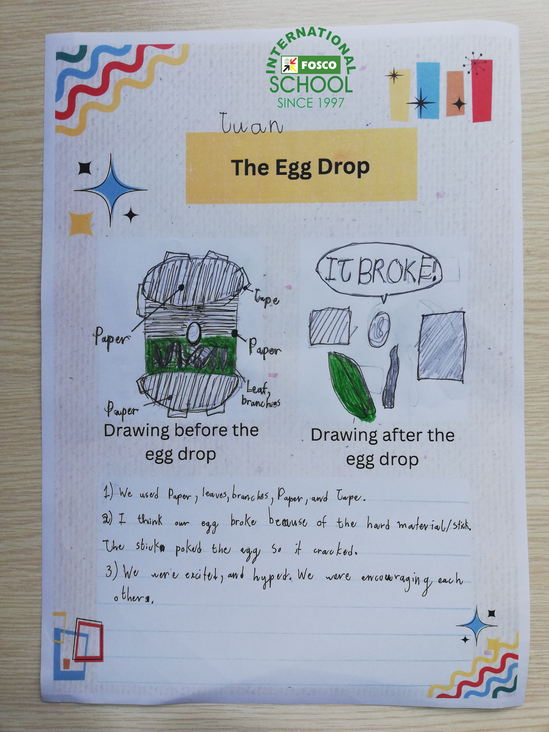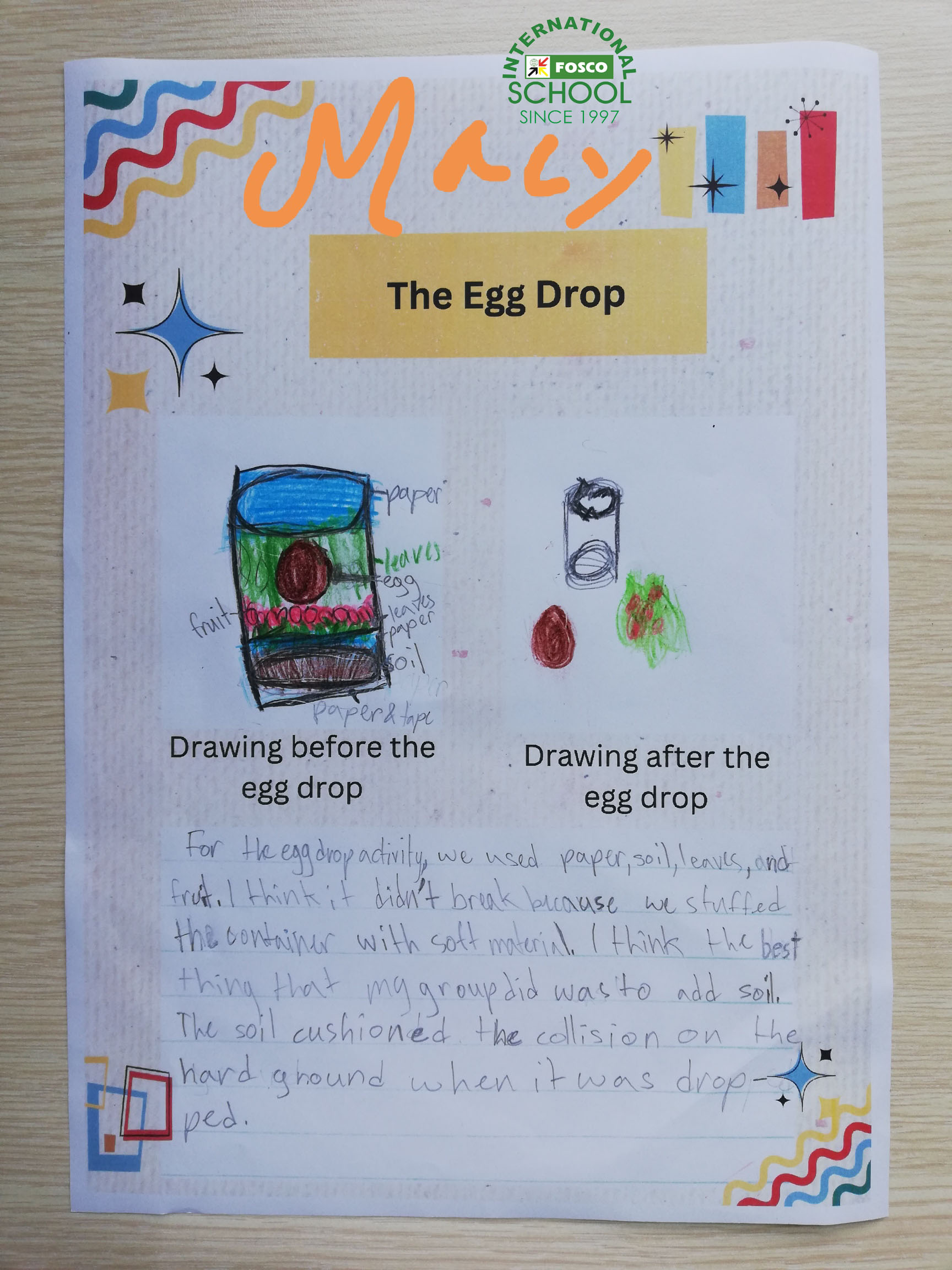 For a STEAM lesson, the 5th Graders did an Egg Drop activity. The groups found many natural materials to prevent a raw egg from breaking when they drop the container from the first floor to the ground floor. Discussions included the concepts of collision, force, inertia, energy, etc. The egg of the group that used soil to cushion it did not break. The egg of the other group that used leaves and twigs broke.