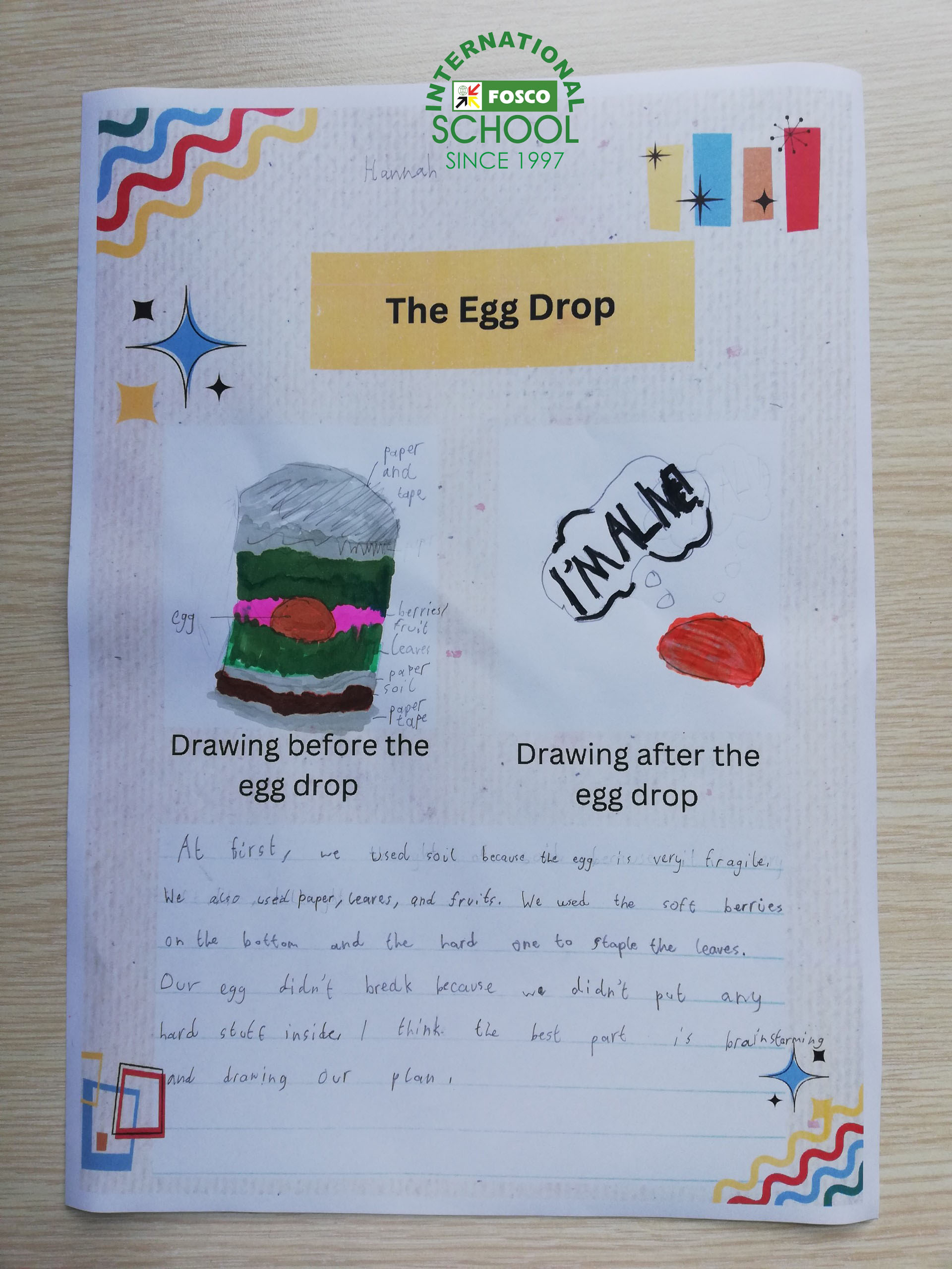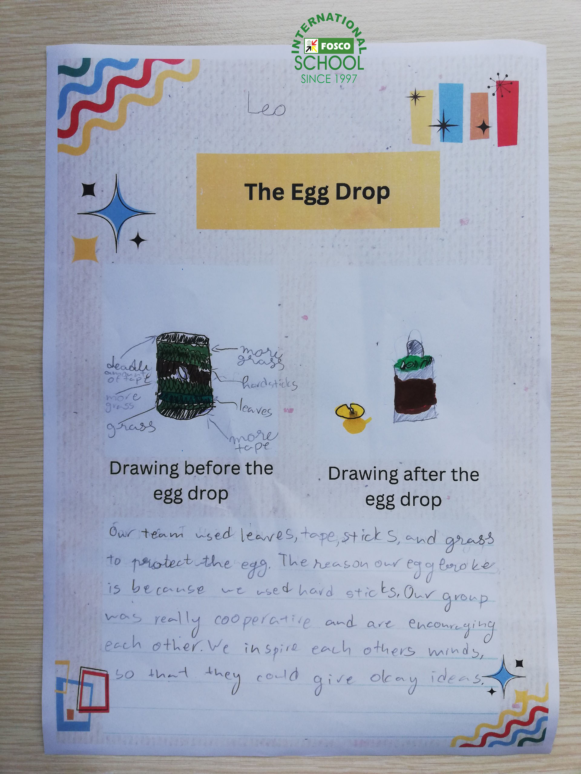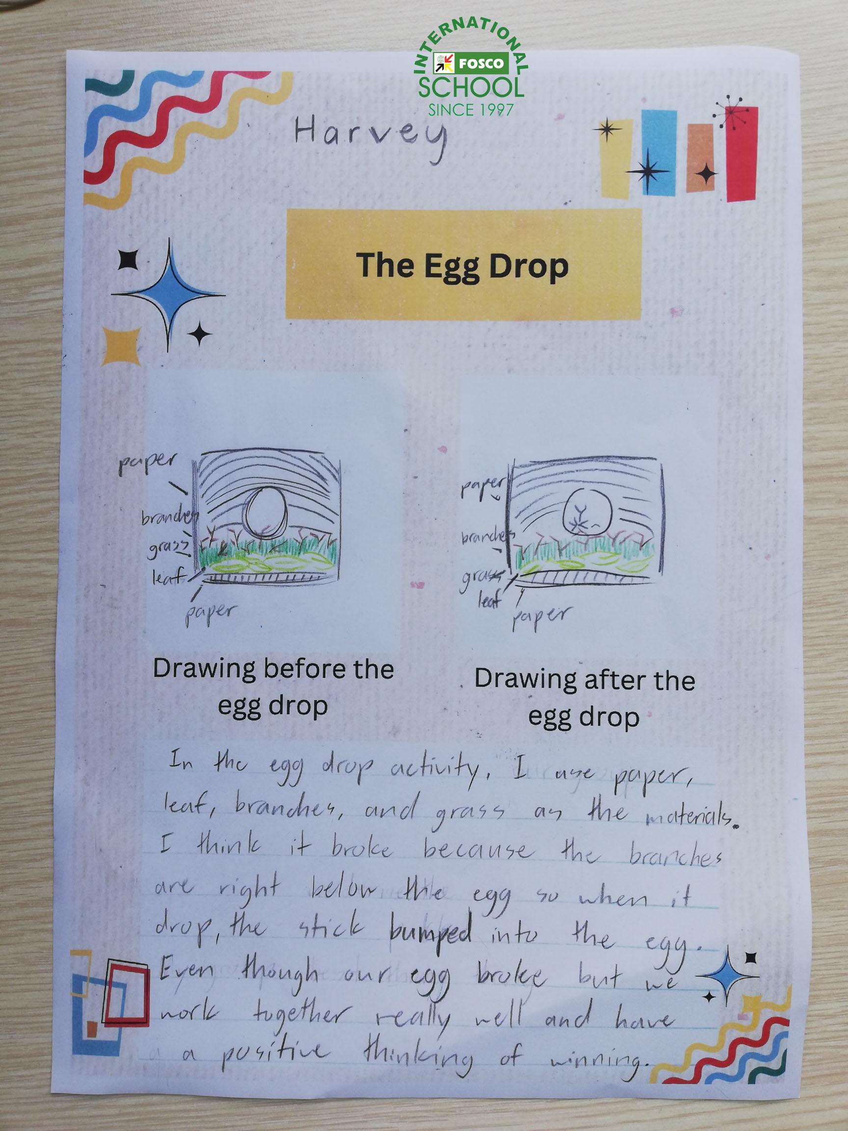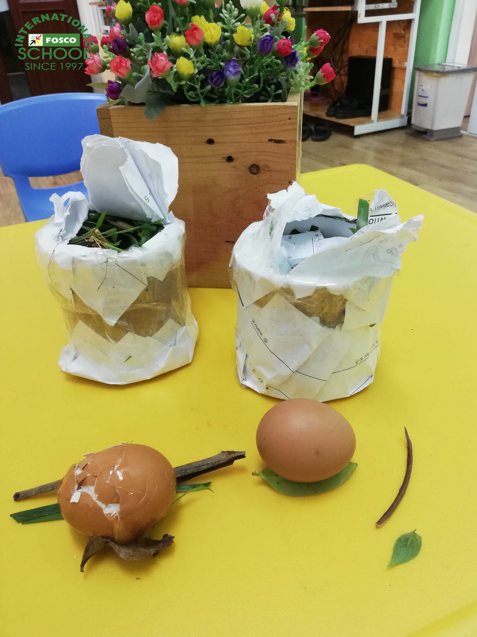 For a STEAM lesson, the 5th Graders did an Egg Drop activity. The groups found many natural materials to prevent a raw egg from breaking when they drop the container from the first floor to the ground floor. Discussions included the concepts of collision, force, inertia, energy, etc. The egg of the group that used soil to cushion it did not break. The egg of the other group that used leaves and twigs broke.