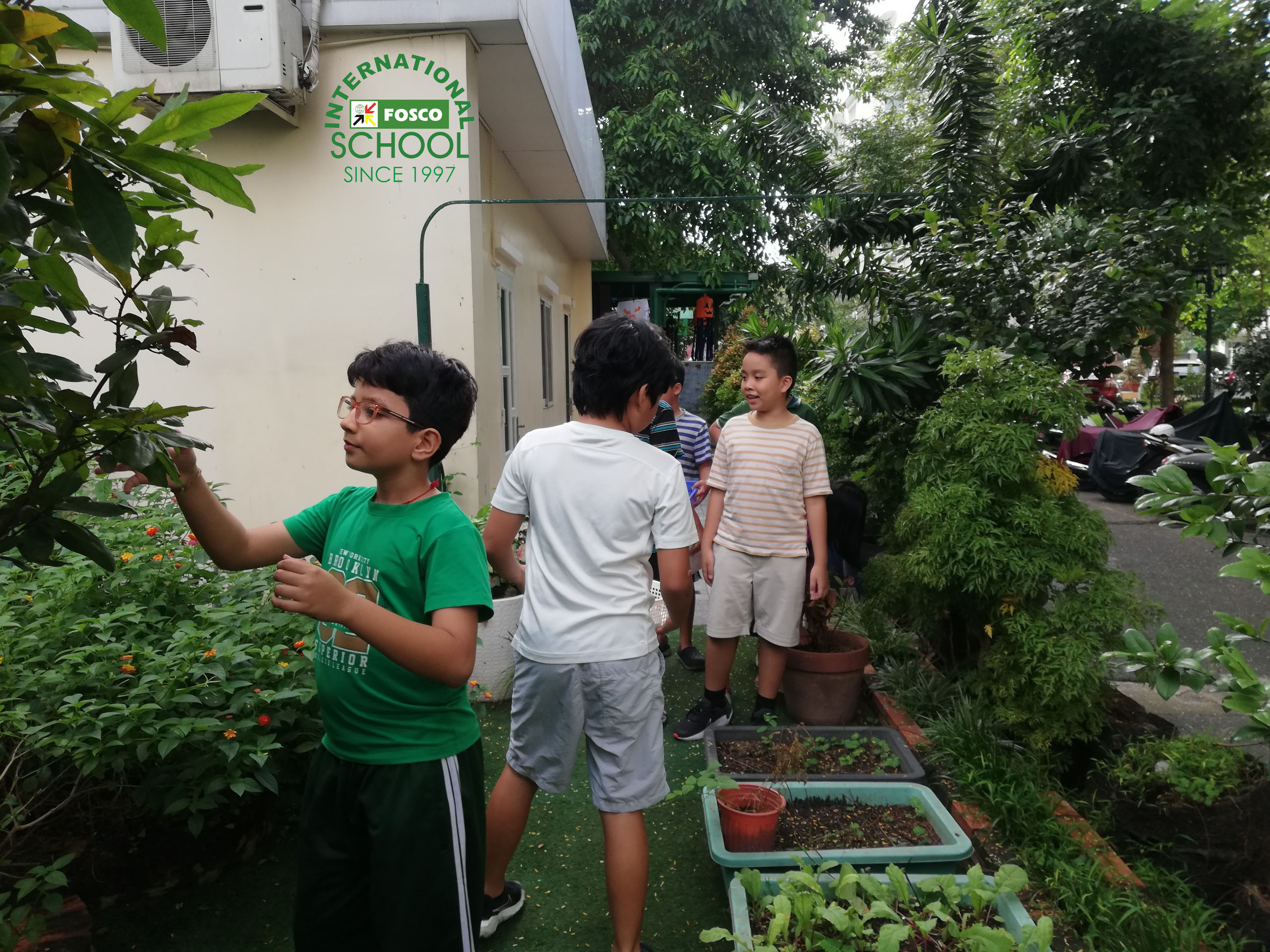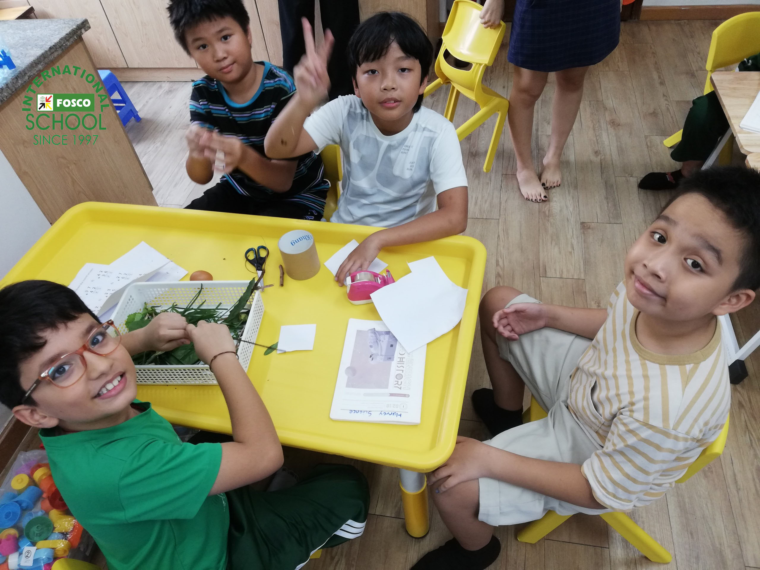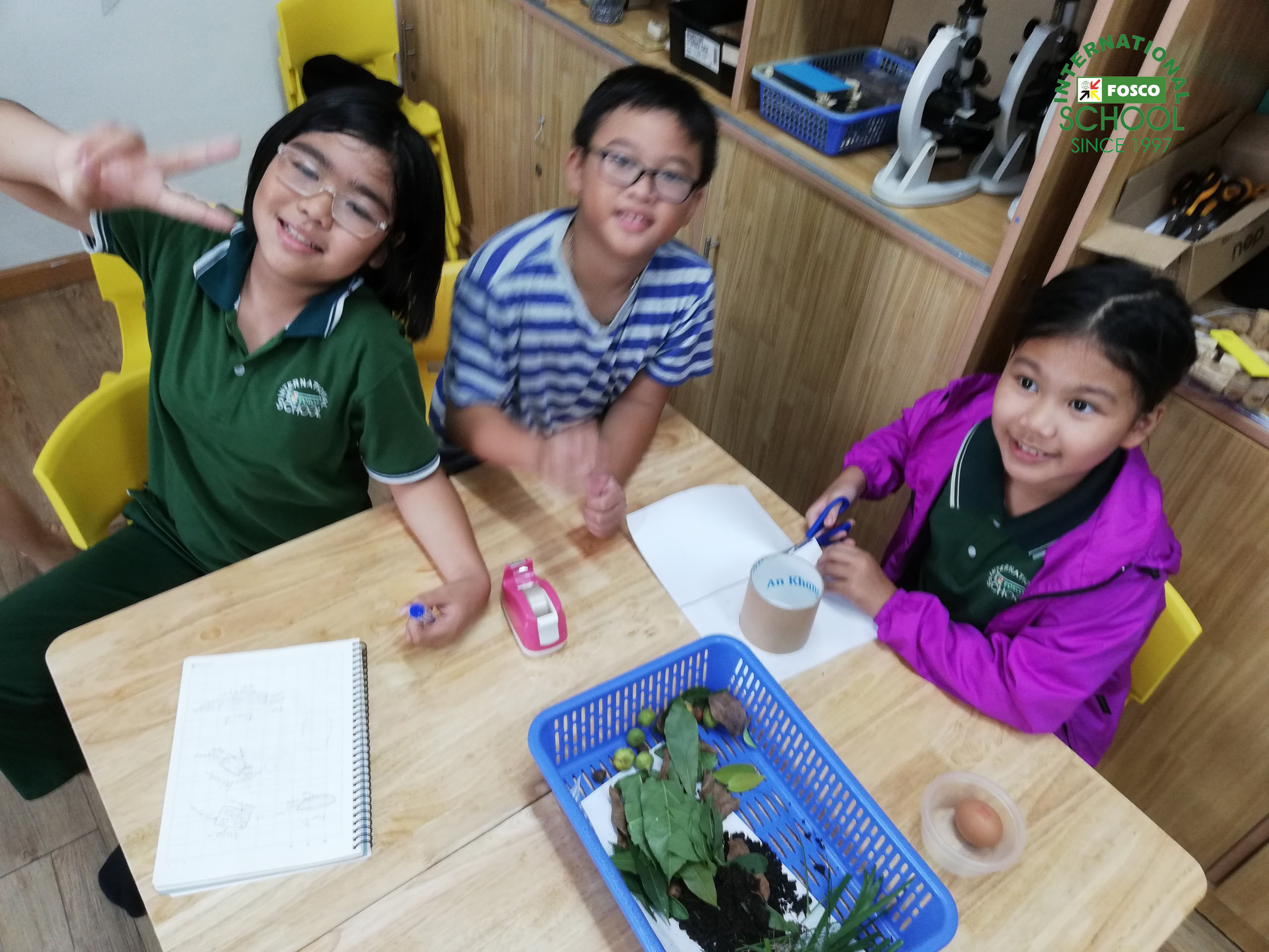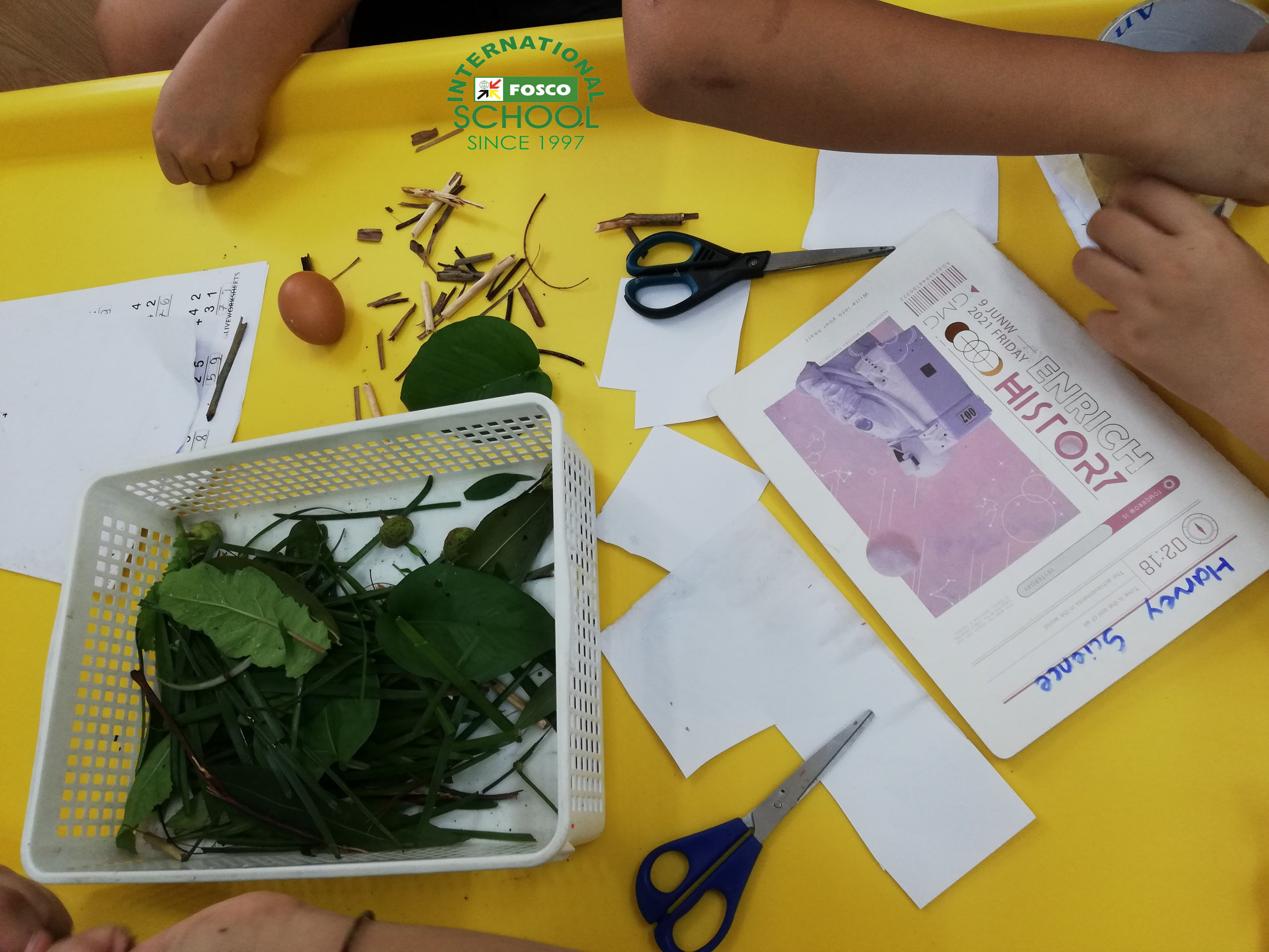 For a STEAM lesson, the 5th Graders did an Egg Drop activity. The groups found many natural materials to prevent a raw egg from breaking when they drop the container from the first floor to the ground floor. Discussions included the concepts of collision, force, inertia, energy, etc. The egg of the group that used soil to cushion it did not break. The egg of the other group that used leaves and twigs broke.