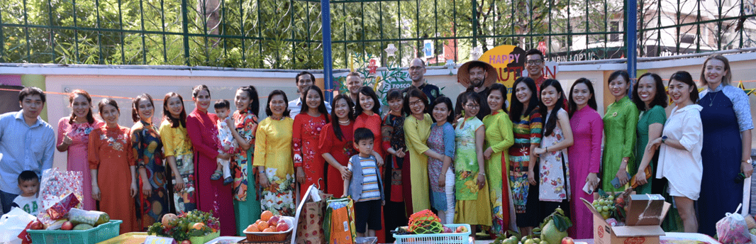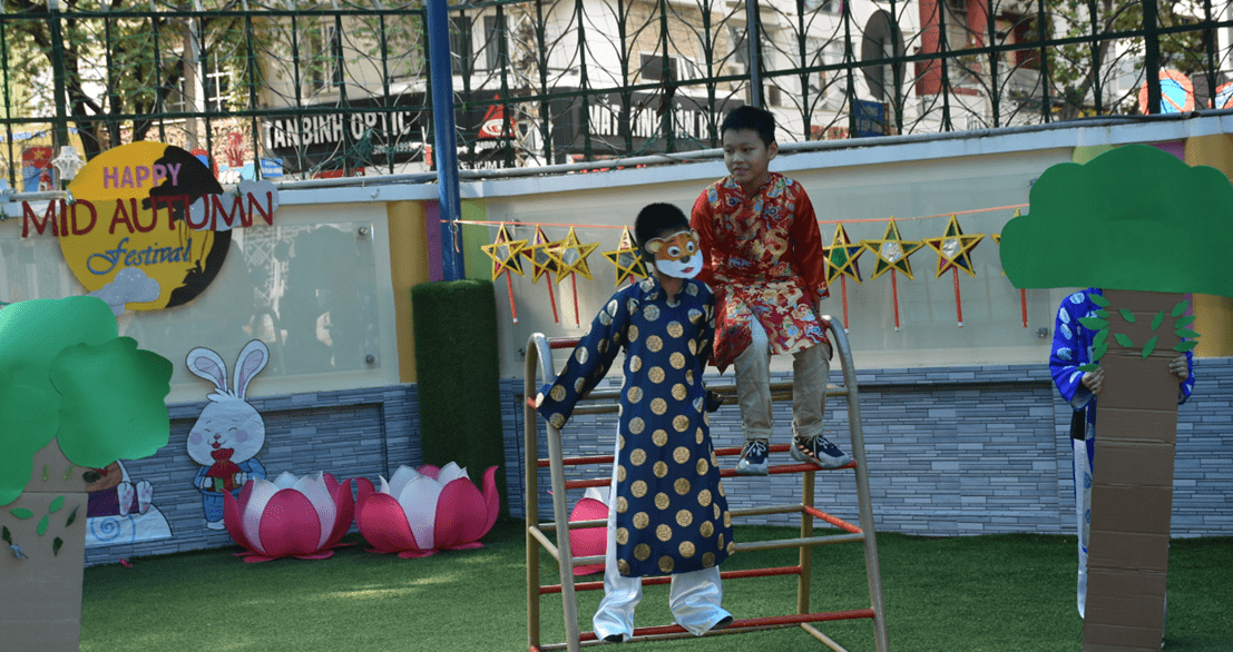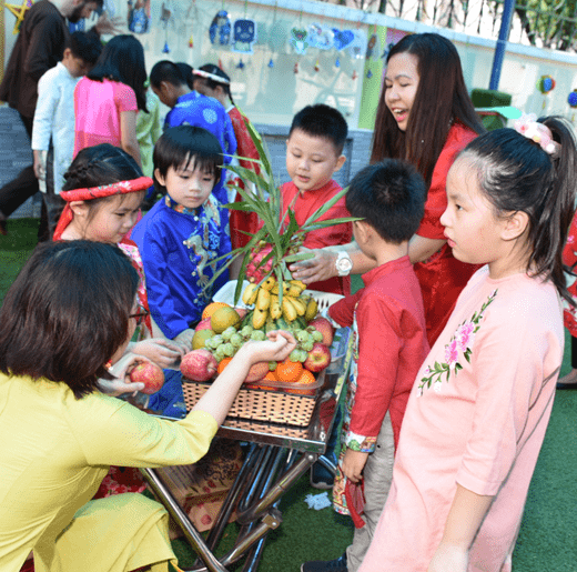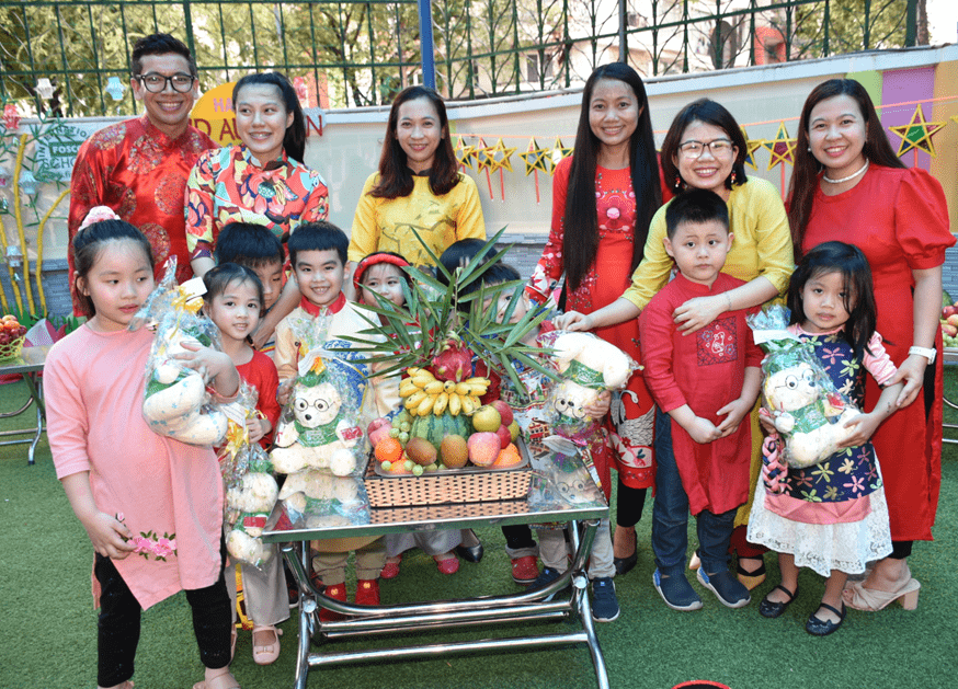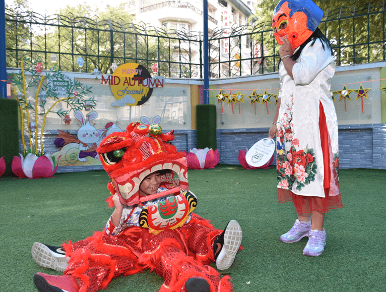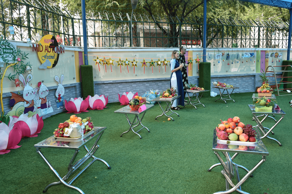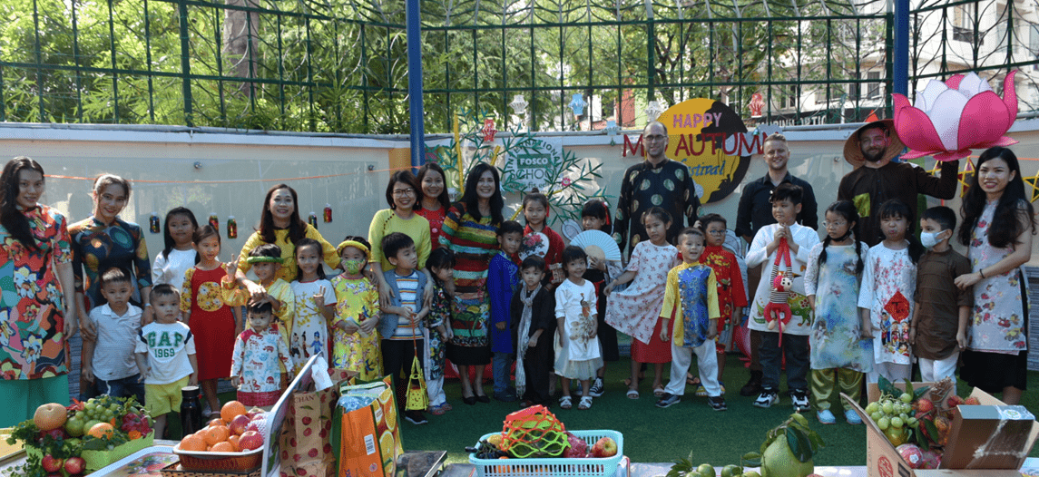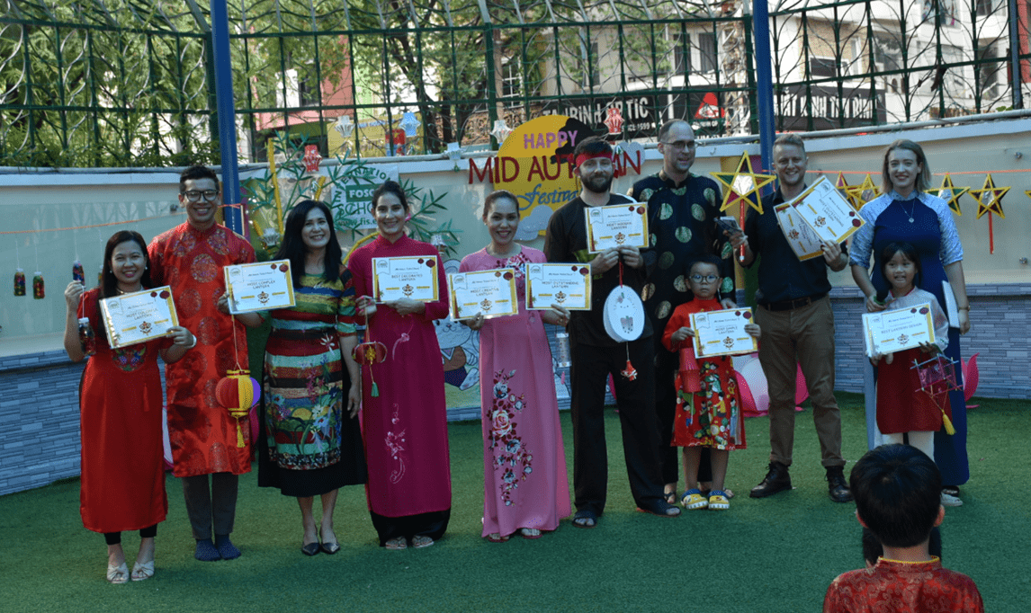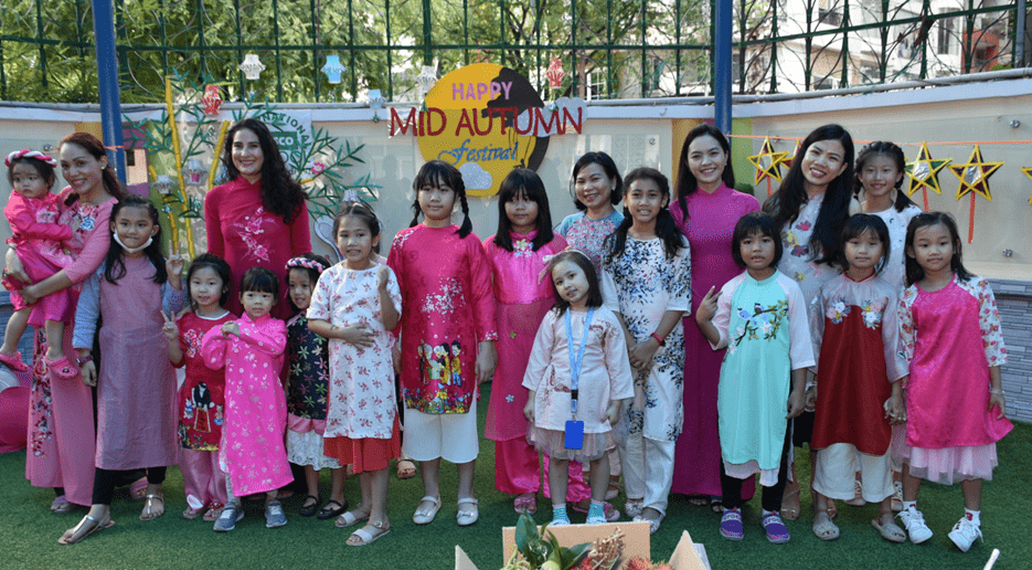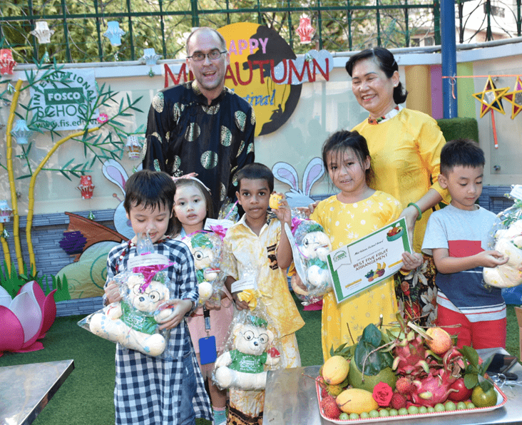 After the entertainment, all classes participated in a fruit arranging competition. Four students from each grade collaborated on a fruit arrangement using their creativity. 1st grade and Kindergarten were the winners! During our break time, the entire school enjoyed moon cakes and took many photos with friends, teachers, and staff. We even took photos by Ao Dai color!