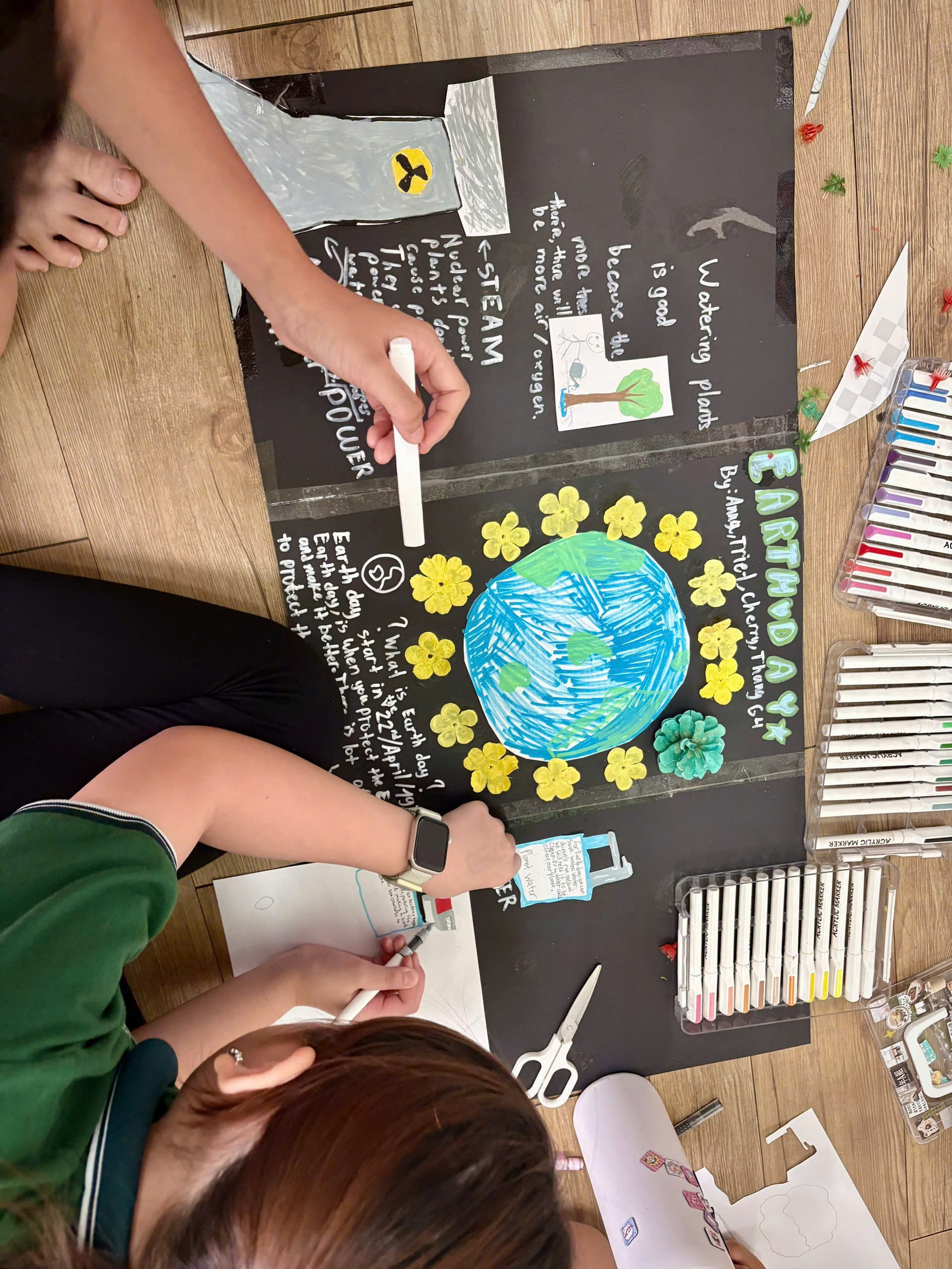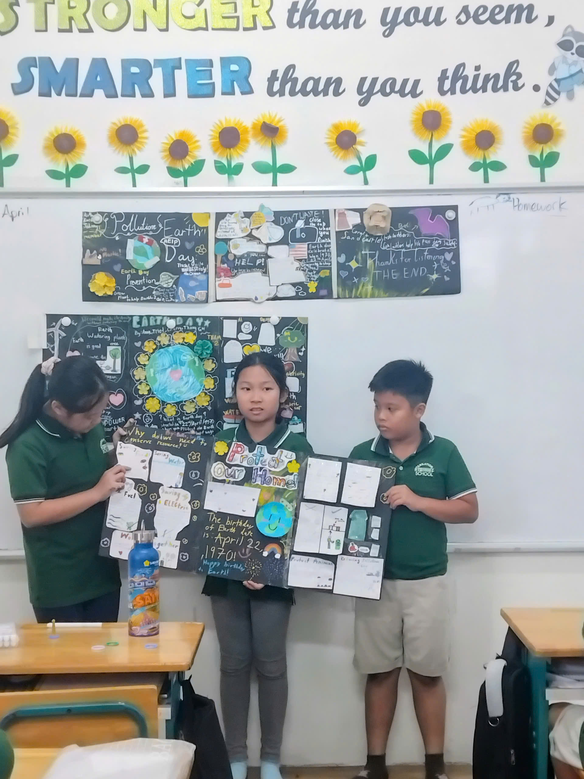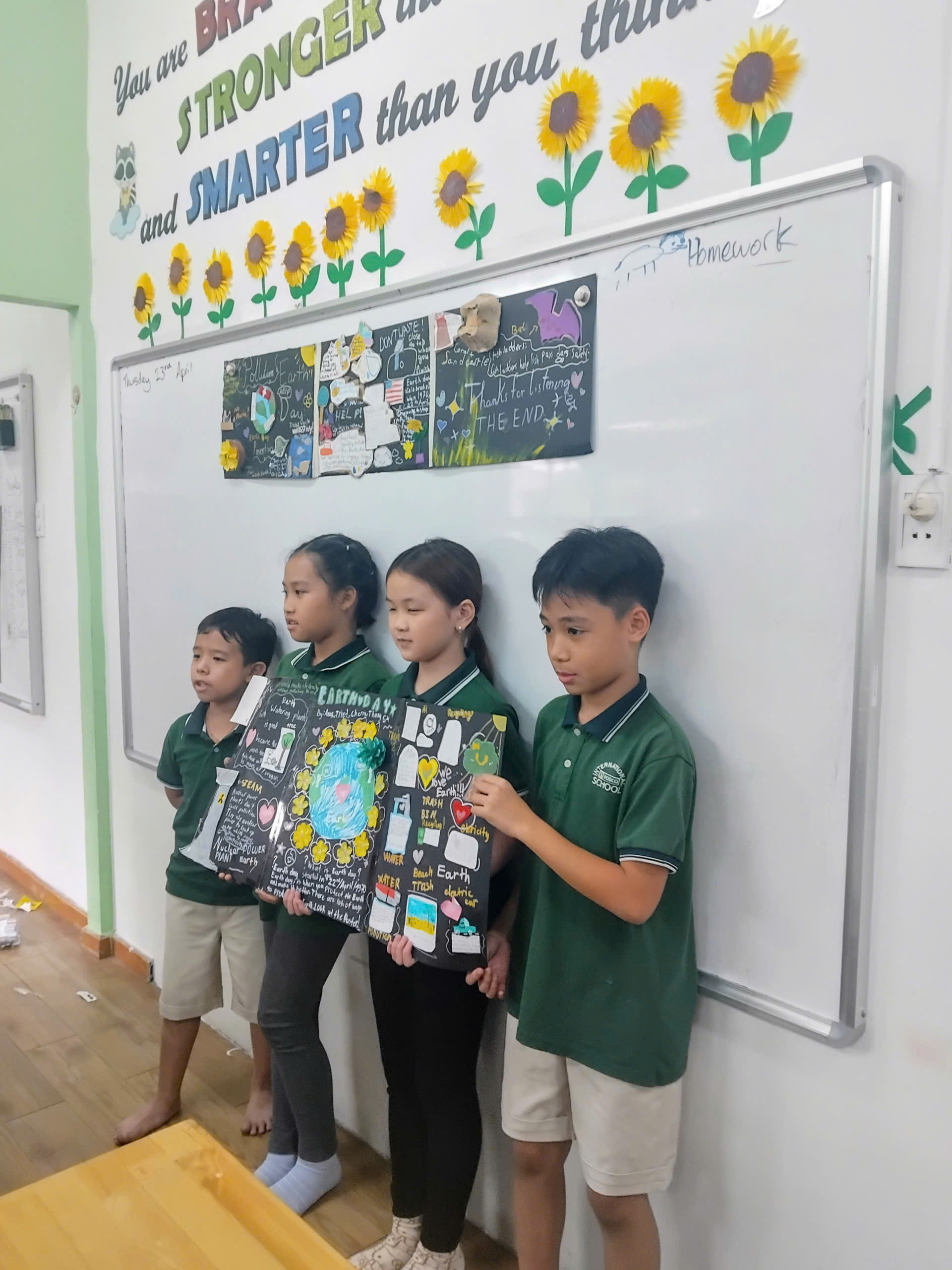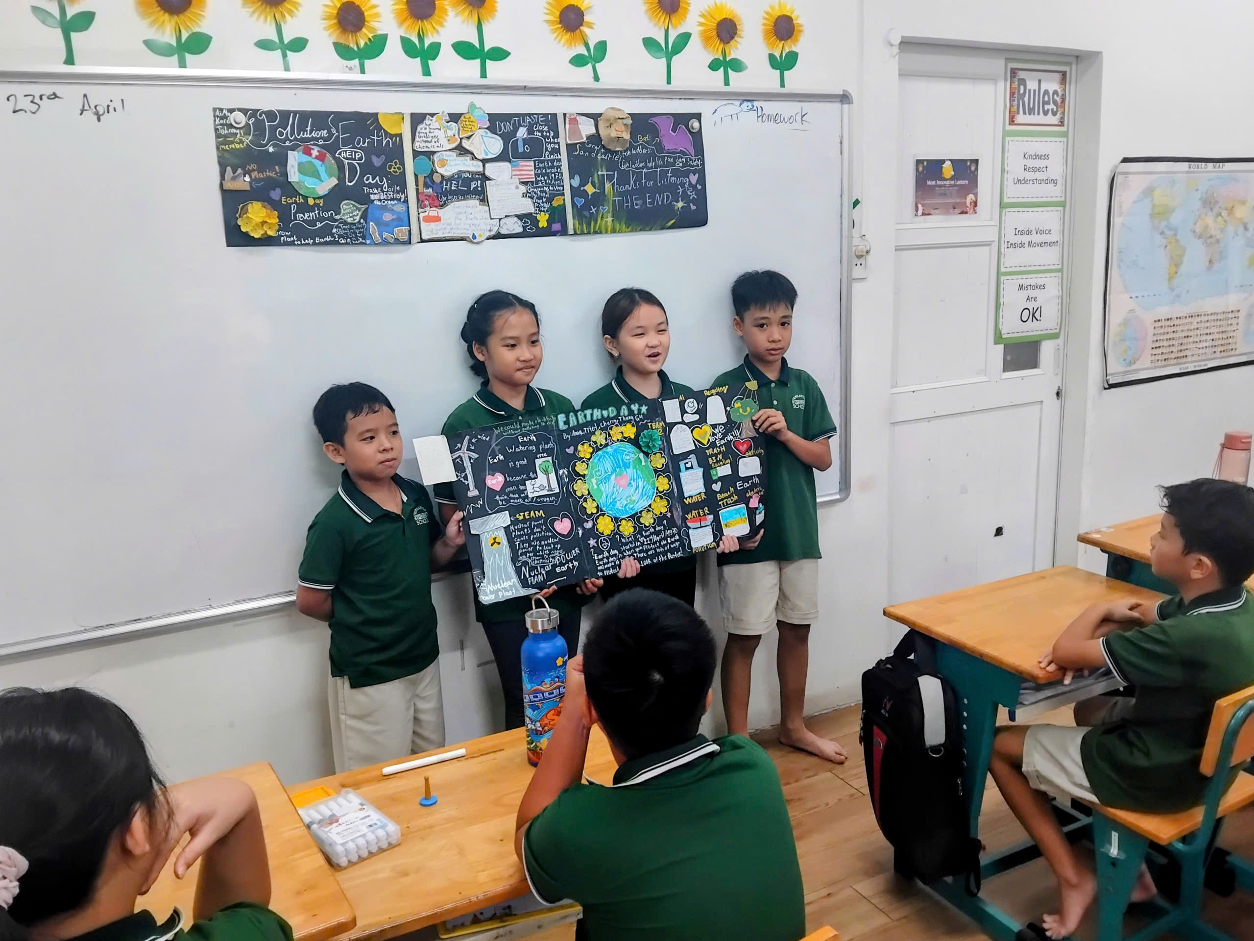 Grade 4 conducted research and then worked in teams to create posters from recycled materials celebrating Earth Day ![]()