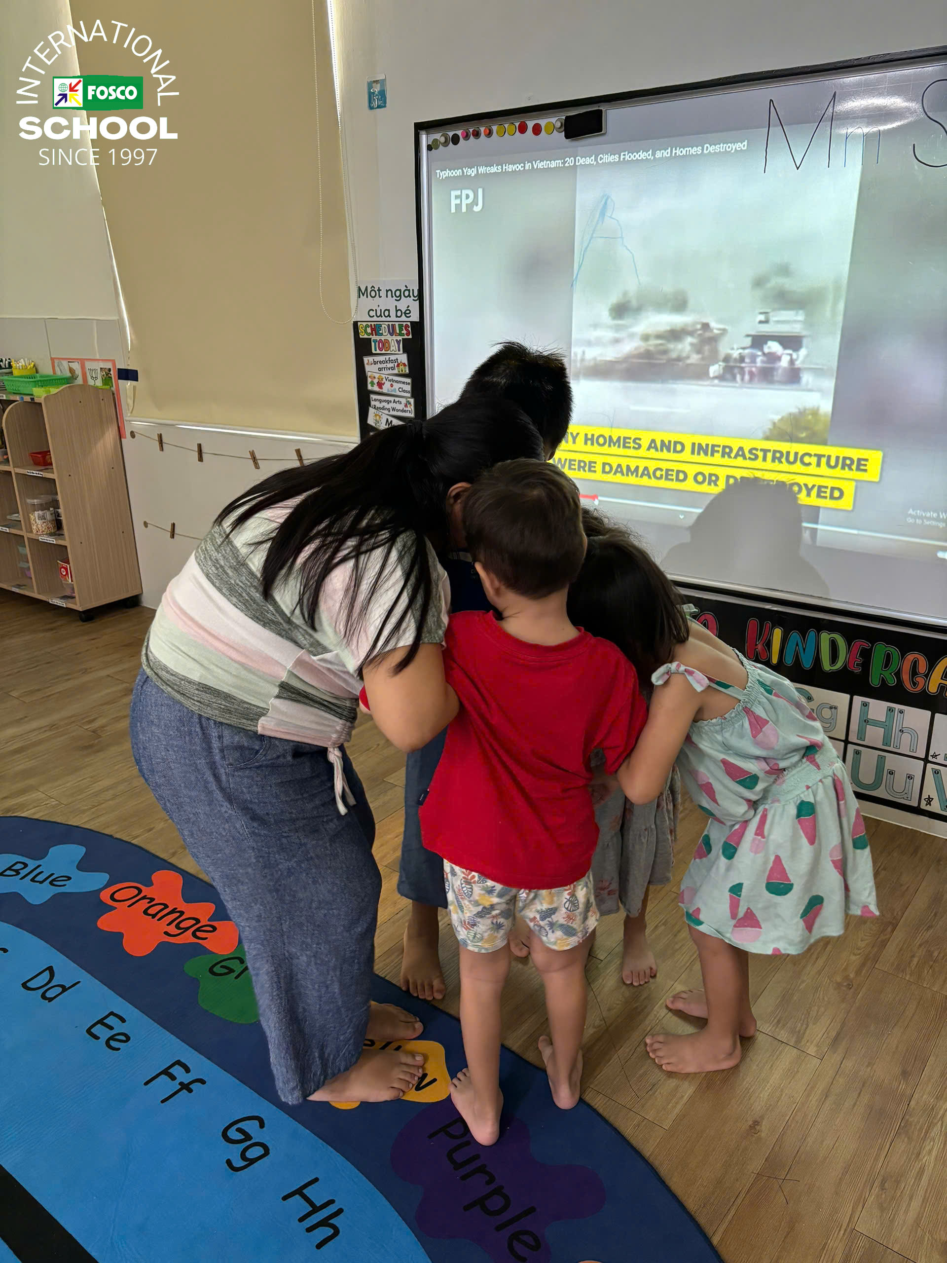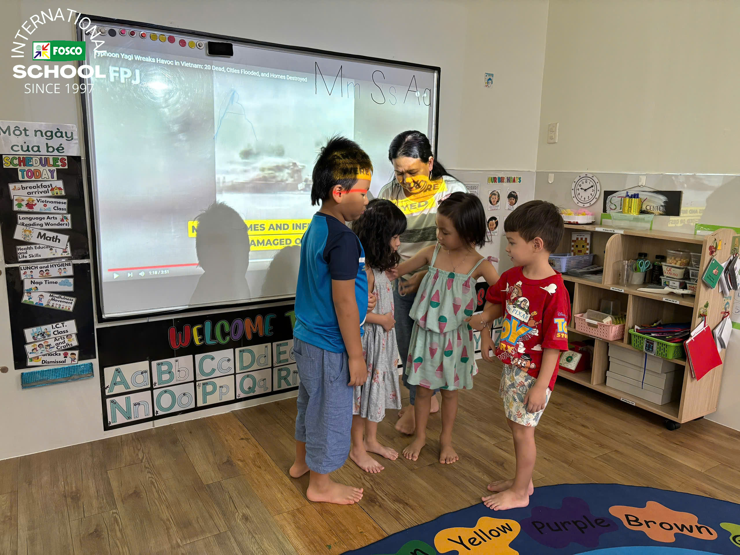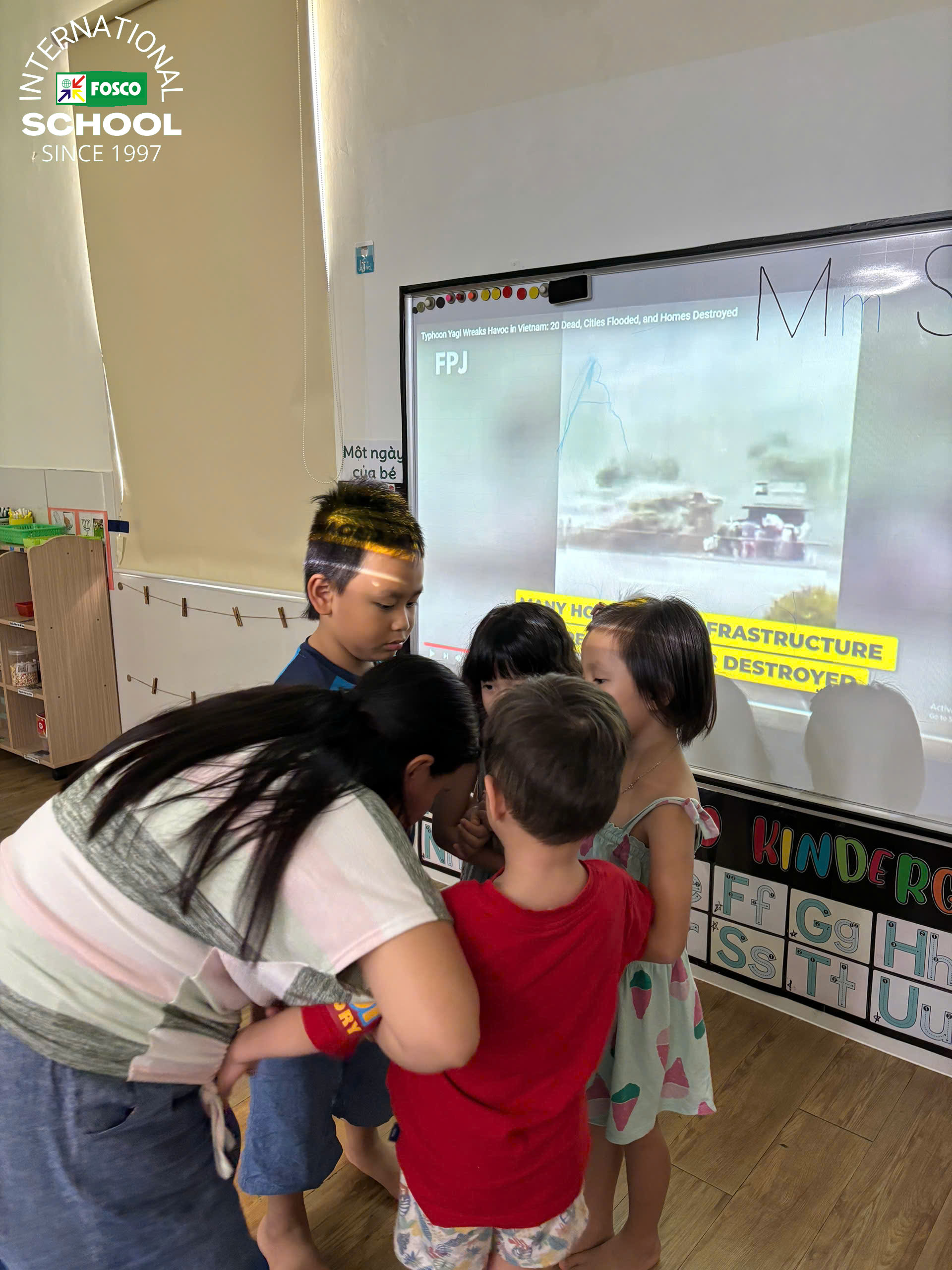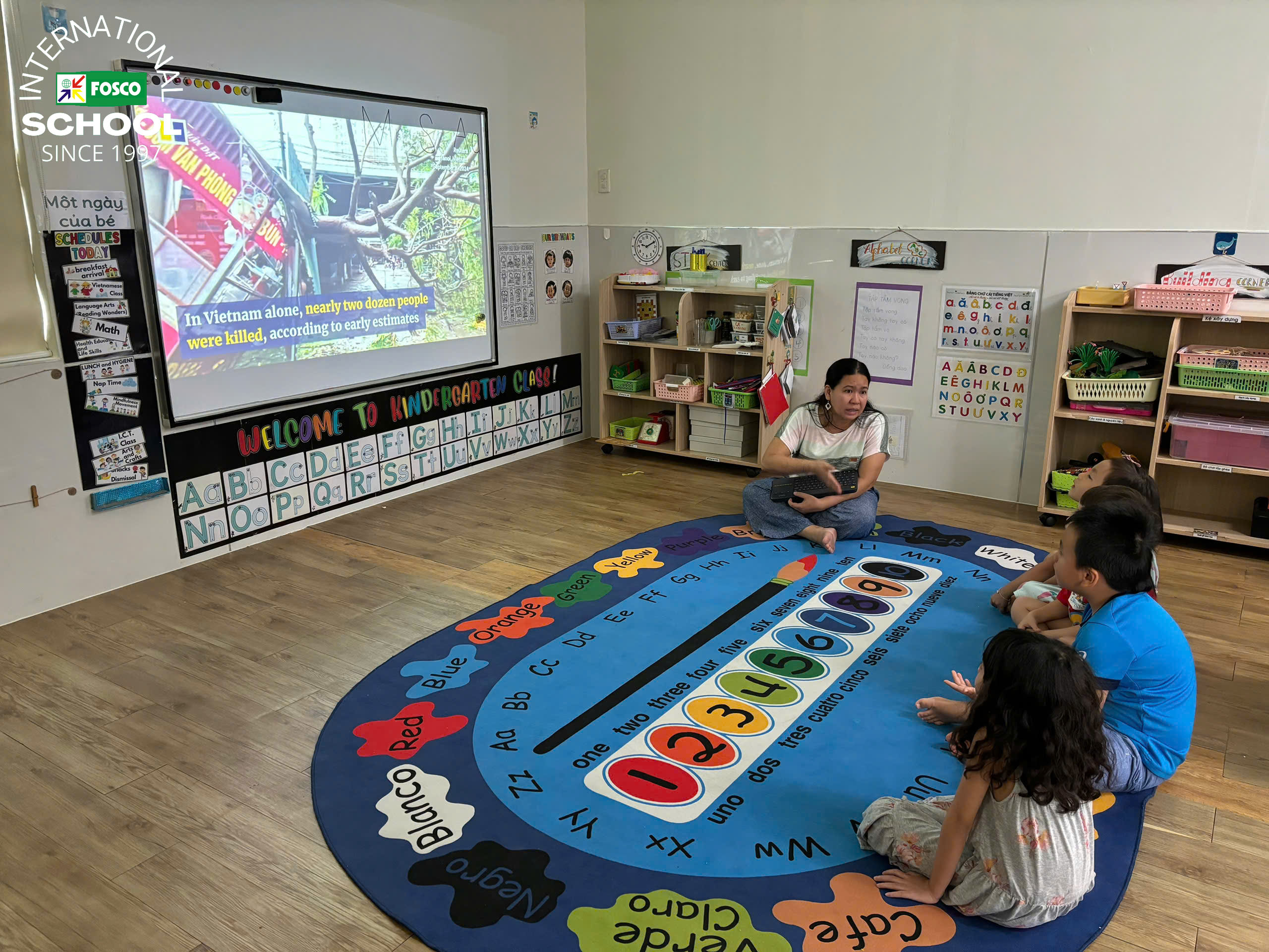Kinder had a meaningful discourse about the devastating situation in the Northern part of Vietnam which was caused by the recent typhoon Yagi. Kinder students taught how to stay safe from severe winds by "staying together" and seeking a sturdy shelter during a tornado. Kinder captains expressed their sympathy by thinking of sending food and money to help the affected people. This social studies session ended with a grateful heart for having a better situation here in Ho Chi Minh City and aiming to plant more trees to prevent flooding.